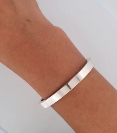Bracelet bangle solid 925 sterling silver, ~16 g, flat classic shape, push button clasp, diameter 60 mm, 50 mm, width 5 mm, size 18.8 cm / 7.4", 15.7 cm / 6.1"